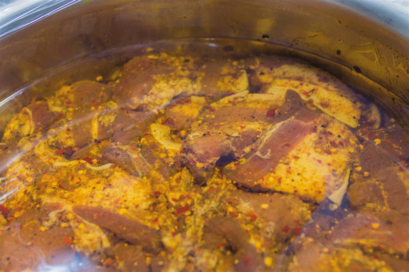 多种调料熬制的秘制酱料,要把肉提前腌制4个小时。肉的厚度切的刚刚好,每种肉质都用不同酱料腌制,每块肉都像做了按摩似的,酱料充分的包裹在每一块肉上。