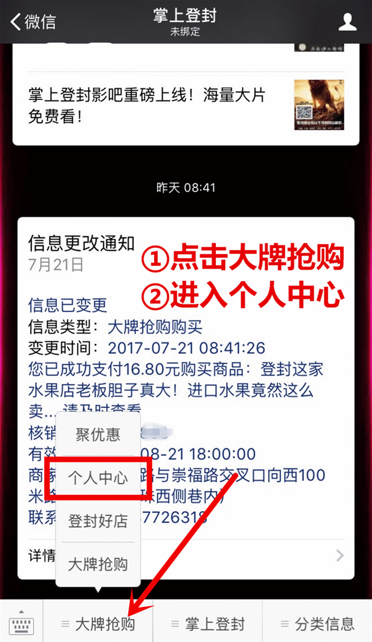 3.关注“掌上登封”或者“登封论坛”公众号点击下方自定义菜单大牌抢购进入大牌抢购子菜单,点击进入需要抢购商品,点击立即抢购,完成付款即可!