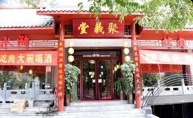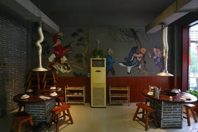 环境真的是充满了江湖的气息,昏暗的灯光,木桌木椅,墙面上画的全部都是水浒英雄好汉。坐在这里吃饭,分分钟把你拉入水浒传的氛围里。