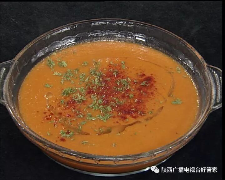 第三步:出锅前可以用盐、胡椒粉调味,再放入搅拌机搅拌,装盘,撒上法香、辣椒粉、橄榄油,这道蔬菜浓汤就制作好了。