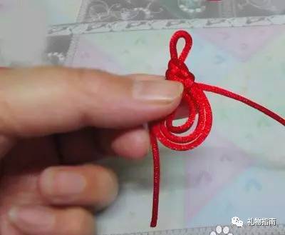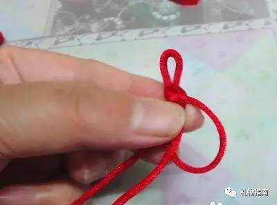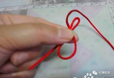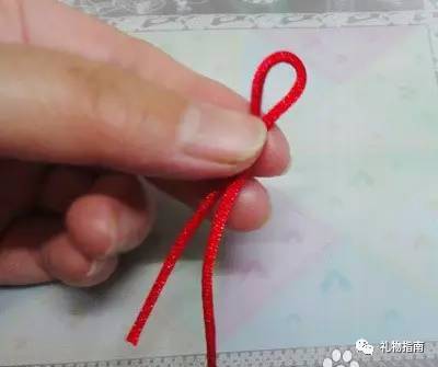 我们用右边的绳逆时针从红绳的上面绕到后面,此时下面也形成了一根圈圈