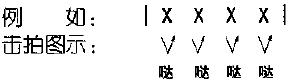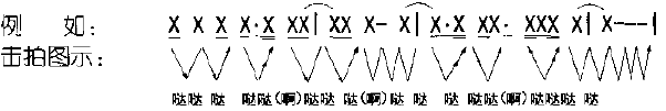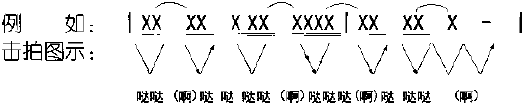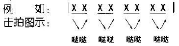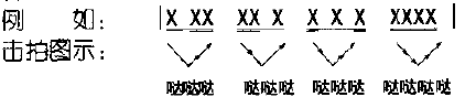 将上例中的前半拍和后半拍的八分音符再分解成时值均等的两个音符就构成了十六分音符。击拍时手(或脚)击下唱两个音,上提唱两个音,注意动作和发音的连贯、统一。