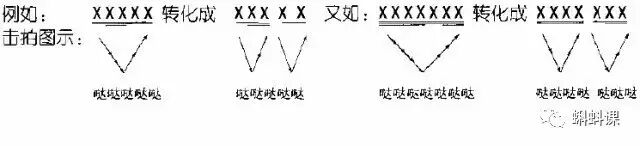 复杂节奏都是由简单节奏提高速度、增加音符而形成的。练习时要先将速度放慢,把复杂节奏分解成简单节奏,唱熟后再按原速练习,这些节奏看起来很难,不易念唱,但经过分解转换便十分简单。