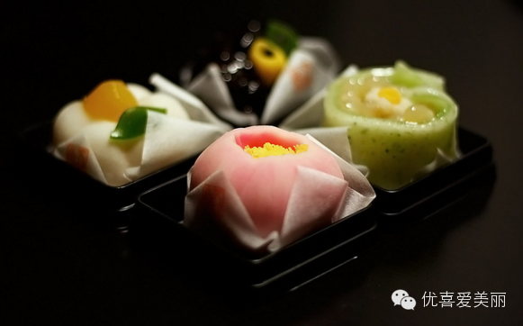 和菓子(わがし)就是日式茶点,后来为了区别西洋过来的蛋糕呀慕斯啊,于是特意叫和果子。其实呢,日本茶道文化,是由当时日本的遣唐使,将中国唐代的饮茶习惯带回日本。其中,包括了茶道文化、和果子。当时日本贵族爱不释手,于是给和果子起了许多风雅的名字。像“朝露”、“月玲子”、“锦玉羹”等,就是由日本的皇戚贵族从和歌中取材命名的。
