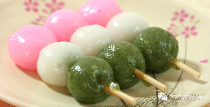 花見団子是春天赏樱花的时候看的,一般是三色: