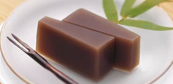 羊羹最早是从中国传入的羊肉汤,但日本古人不吃肉,便用小麦粉与小豆混在一起蒸熟、凝固,做出类似肉的效果,这便是和果子羊羹的开端。进入江户时代,日本人从红藻中提取出了琼脂,加入羊羹之中形成了“炼羊羹”,逐渐形成了如今的长方形状。