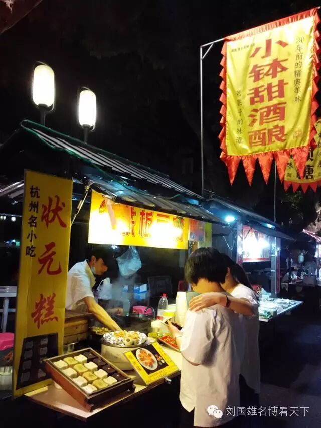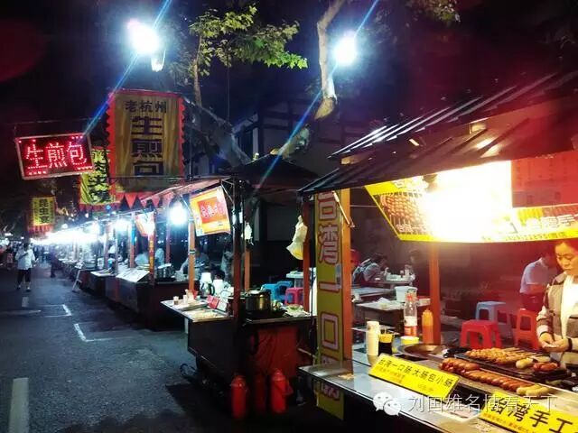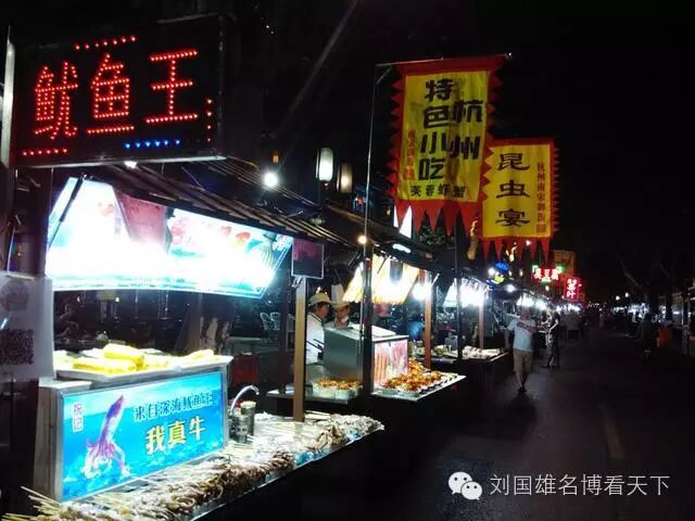 河坊街与南宋御街相连,南宋御街是南宋都城铺设的一条主要街道。穿过这条街就是鼓楼,鼓楼的对面就是美食街,网上对这条街有几个叫法,中山南路美食街、鼓楼美食街、南宋御街美食街,我觉得都是同一个地方。这里既有装修高档的饭店,也有价廉物美的大排档,还有很多小吃摊。除了有很多杭州特色美食,杭帮菜、倒笃菜、状元糕、馄饨等等,还汇聚了各地的美食,最有意思的是昆虫宴,我一直以为吃昆虫只有云南、广西、广东比较多,没想到杭州也有,而且更强悍,什么蜈蚣、蜘蛛、蝎子都有,炸着吃的,要吃必须胆子够大。如果不是吃太饱了,我真想试一下,我一点都不怕,还比较喜欢吃昆虫。这里是做夜宵的,特别适合来杭州玩的时候,晚上出来喝酒。