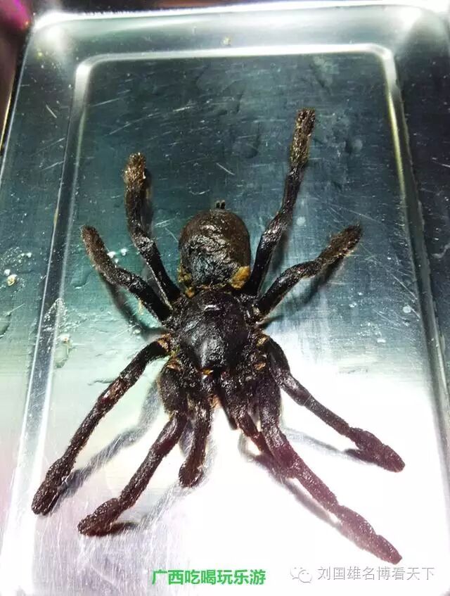 蜘蛛,这种大黑蜘蛛,我在柬埔寨旅游的时候吃过,没想到这里也有