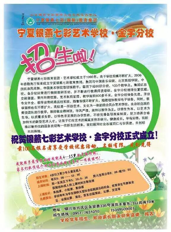 宁夏银燕七彩艺术学校于1992年经银川市教育局批准成立,宁夏银燕七彩教育集团2006年经教育厅批准成立,2010年在北京批准成立北京银燕七彩国际文化艺术交流中心。