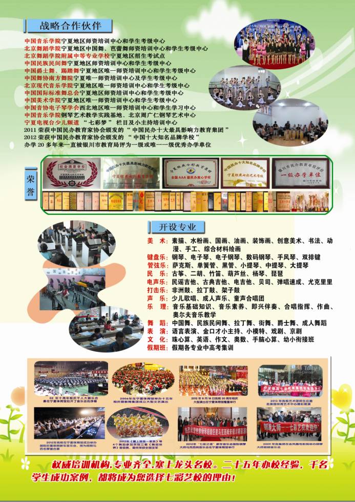 热烈庆祝银燕七彩艺术学校被中国民族民间舞考级中心评为2015年度全国优秀认证机构及全国特别贡献奖(全国仅两名)!2015年8月18日七彩艺术集团与北京舞蹈学院附中签订宁夏地区北舞附中招生考试点。2015年6月被中国教育联盟评为“百强十优”。20多年来,一直被银川市教育局评为“一级优秀办学单位”或“唯一优秀”一级办学单位。唯一“著名商标”。25年来应邀参加30多个国家的大型演出和比赛。2008年,银燕七彩教育集团被中国民办教育家协会评为“全国十佳教育培训机构”。2011年,银燕七彩教育集团被评为“中国十大最具影响力教育集团”。2012年,银燕七彩艺校被评为“中国十大知名品牌学校”。银燕七彩艺术团曾在维也纳金色大厅、美国林肯中心、悉尼歌剧院等世界著名音乐殿堂展演比赛并荣获“最佳教学成果进步奖”等殊荣。
