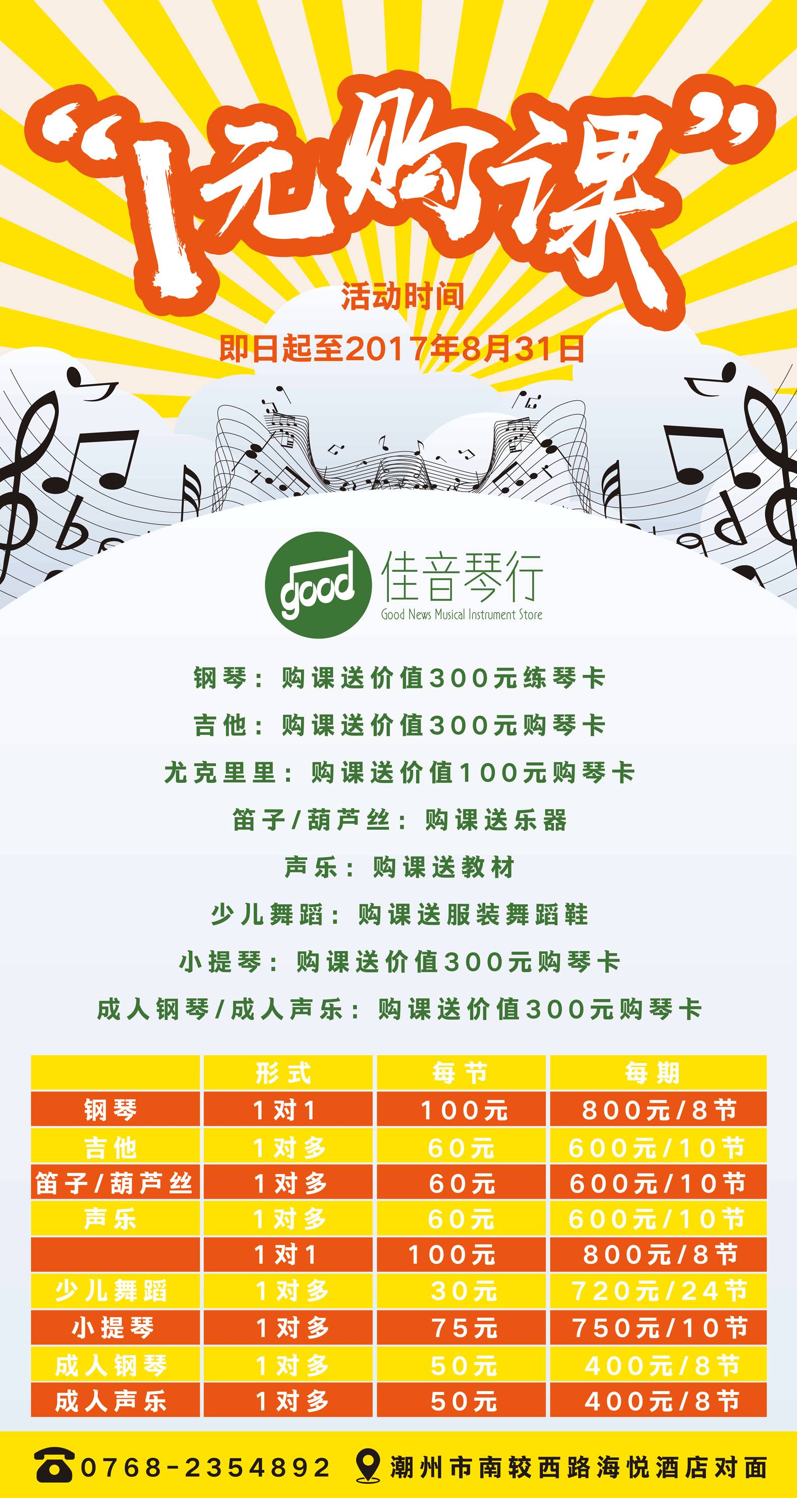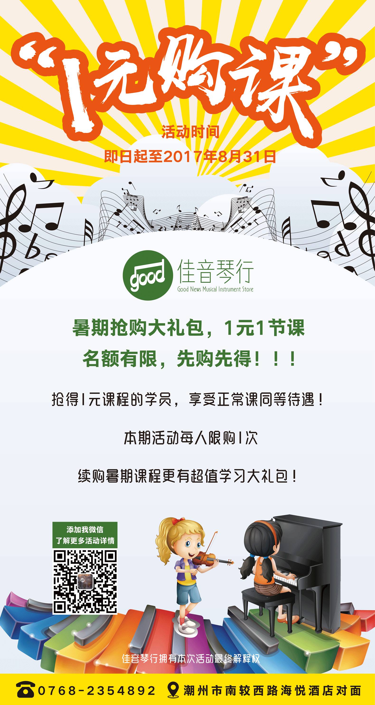 地址:潮州市湘桥区南较西路349号佳音琴行 (海悦酒店对面)