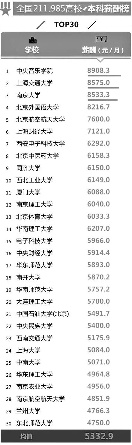 前不久,《南方都市报》统计发布了2017全国211、985高校平均薪酬榜,中央音乐学院以8908.3元独占鳌头,榜单的第30名东北师范大学4750几乎只有中央音乐学院的一半,清华和北大甚至没能入围前30。不知道其他专业的同学看了这个榜单怎么想,反正我是绝对认可的,一个音乐专业的毕业生每周末教两天琴就能挣到这个数。我甚至想代表音乐专业说,文理科的同学们,北大清华的同学们,别羡慕嫉妒恨,姆们已经够给你们面子了!要是有人统计中国在校生兼职薪酬榜,想都不用想,所有的音乐学院和电影学院包揽前20,你们只能够着姆们的零头哩,信不信?服不服?