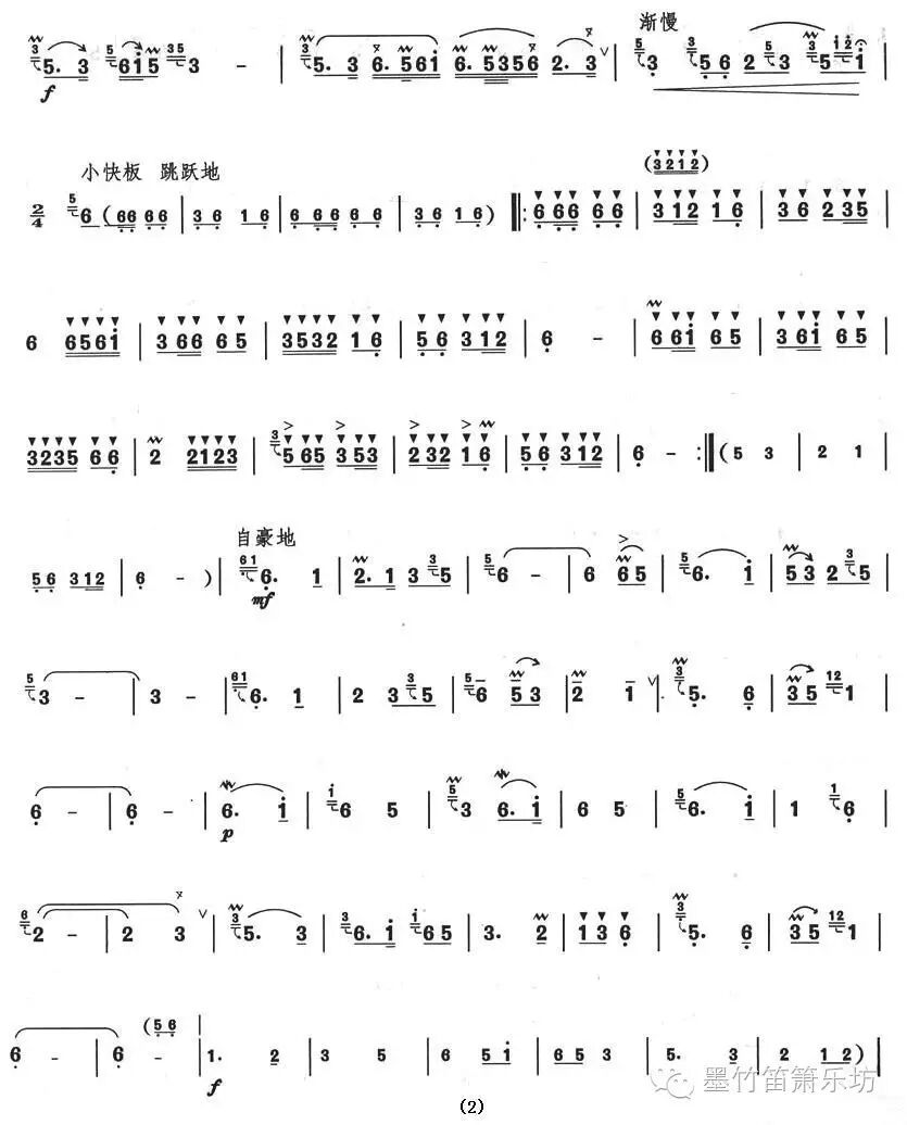 第二段是跳跃的小快板,把前面慢板曲调加以变奏处理,运用双吐和三吐的技巧和跳跃的节奏型,描绘出牧民骑着骏马的欢乐景象。