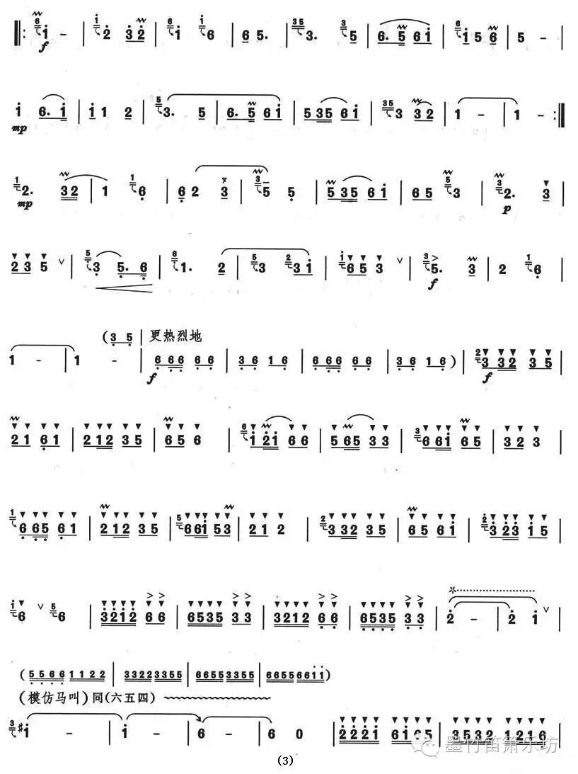 第三段将主题音乐的节奏拉宽,旋律热情舒展,表达了牧民对新生活的纵情歌颂。乐曲的第三部分是一段小快板,用于表现蒙古短笛民歌明快节奏的特点,以笛子跳跃的三吐加双吐的技法演奏,用马玲和木鱼伴奏,模仿牧民策马奔驰时的欢快的马蹄声,描写牧民在广阔的草原上放牧的欢乐情景。蒙古民族一直以来都是游民民族,在生产、生活中都要以马代步。一年一度的达幕大会,更是有赛马的项目,用笛子的三吐加双吐来模仿马蹄的声音,能够形象地表现出骏马奔腾的效果,仿佛是那达幕大会骑手们在角逐,晚会上热烈欢畅的骑马舞蹈,拿着套马杆的牧民在马群中穿梭。乐曲把草原生活的景象展现在听众面前。采用的指跳音与吐音相结合的指法,给听者一个奔腾跳跃的感受。这里的旋律上下波动,逐渐向上。