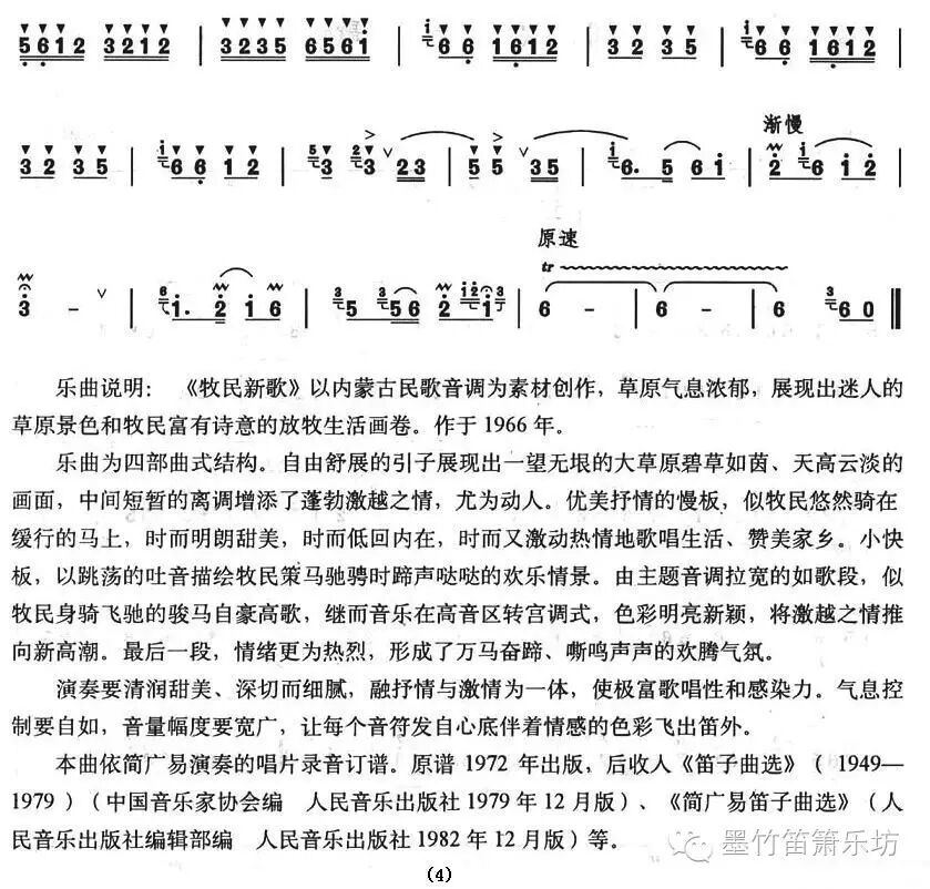 《牧民新歌》是笛子演奏家简广易先生根据蒙古音乐风格创作的笛子独奏曲,是新派笛子的代表乐曲之一。《牧民新歌》在于一个新字,我们能感受到它既是内蒙风格,又有创新的特点。