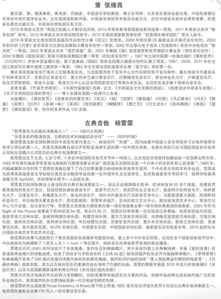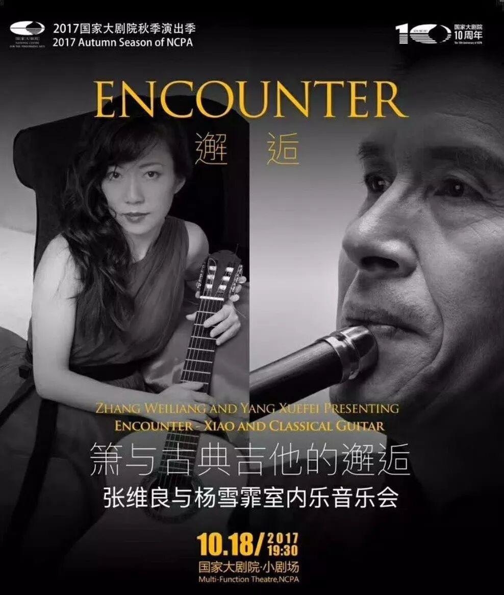 2017年10月18日晚,笛箫演奏家张维良先生与吉他演奏家杨雪霏在国家大剧院成功演出了“邂逅”——箫与古典吉他音乐会。能容纳五百多名观众的国家大剧院小剧场座无虚席,舞台设计简约而不失大气,为现场的观众营造了一种安静典雅的观赏氛围。