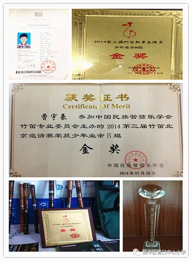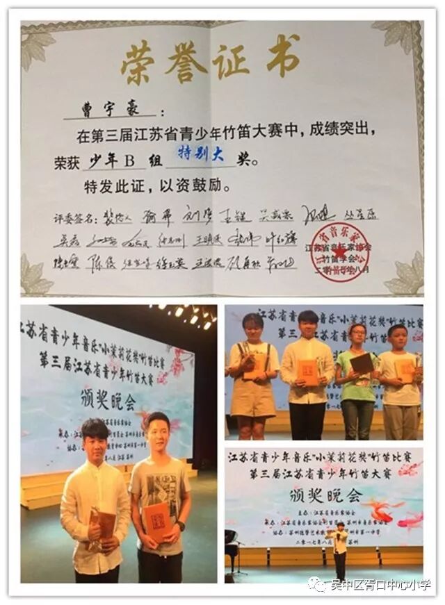 三年的学习,他打下了扎实的基本功,六年级就顺利通过中国音乐学院竹笛考级十级水平,参加全国竹笛邀请赛获得金奖、参加江苏省青少年竹笛比赛获特别大奖,还参加央视CCTV吴中站路演摄制等。