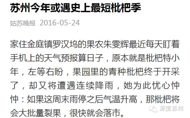据媒体报道,近期苏州的连续降雨不仅会使今年原本就特小年的产量变得更低,还会直接影响到枇杷的甜度;而如果雨后立即转高温天,那么今年有可能也是史上最短枇杷季之一了。