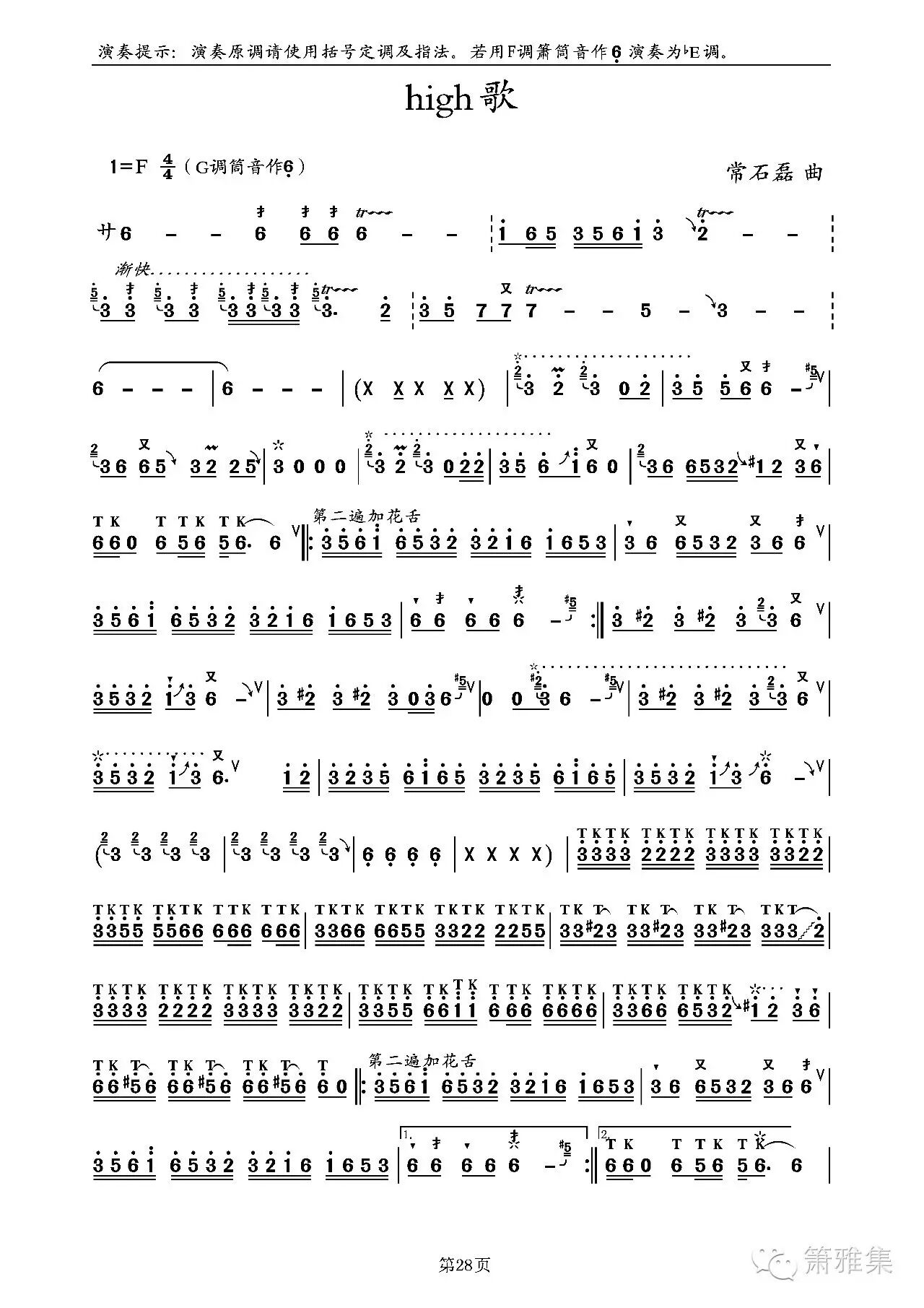 附上洞箫版《high歌》的曲谱,是由箫雅集曲谱版的版主音旋雨律修订打谱的。