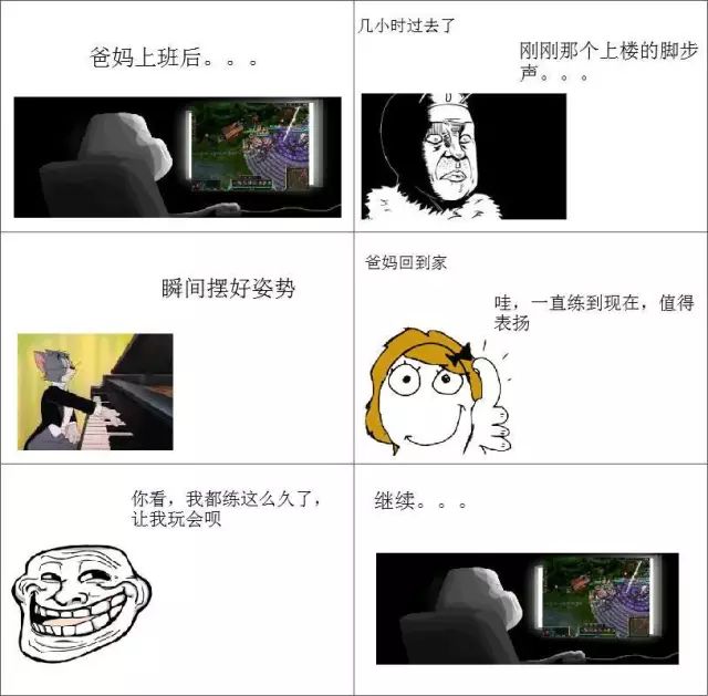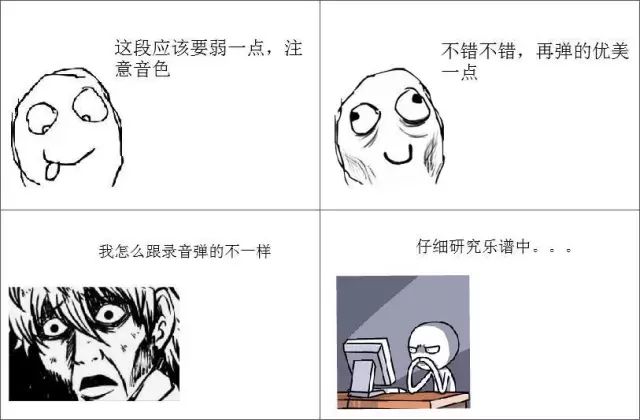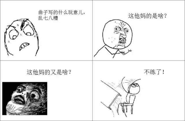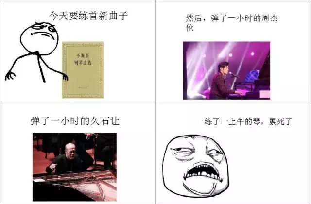 解释:坐在琴凳上,闭目,瞬间无数个音符浮现在脑海中,开始修炼,用意念控制手指,并可随意切换身边的环境,如排练厅,大舞台,音乐会现场等。随着修炼程度的加深,脑袋会出现大幅度的摆动,当你的脑袋“咣”的一声砸在琴键上时,恭喜,你已修成正果!