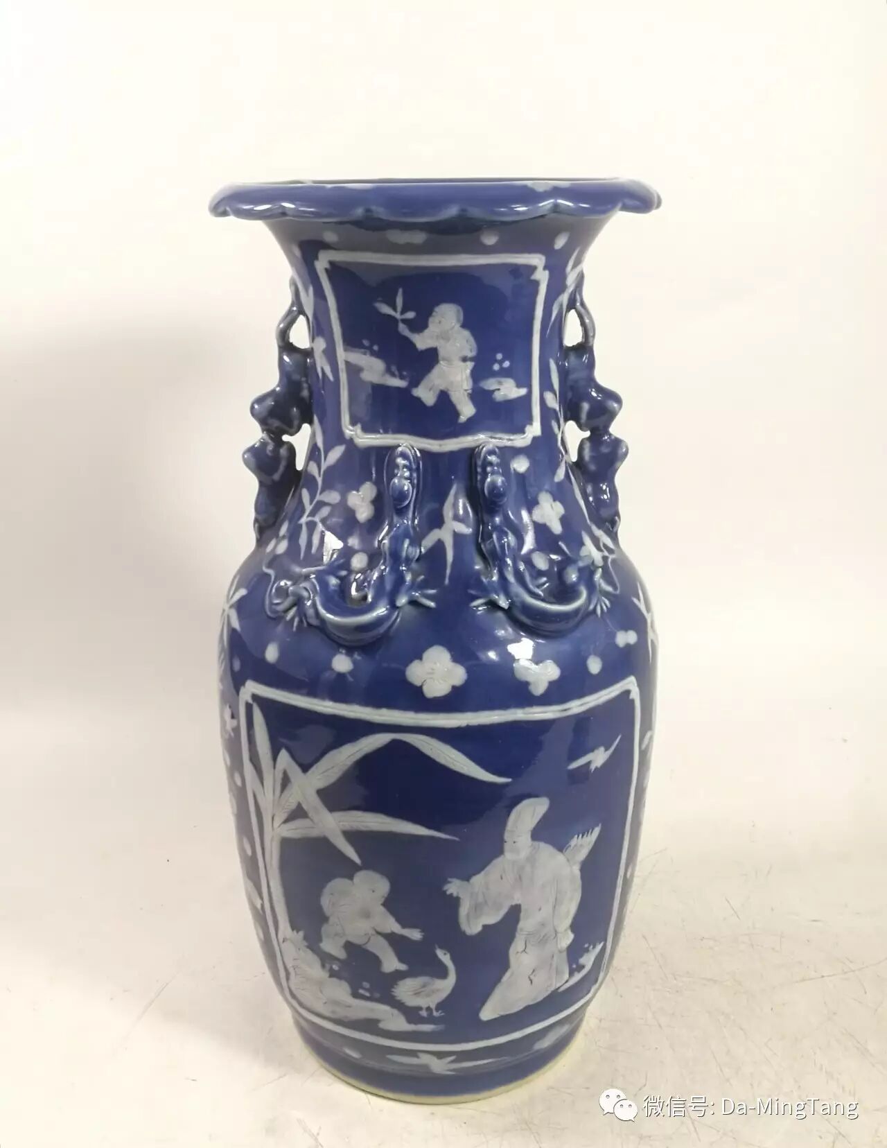 | 380 | 清蓝地堆白开光羲之爱鹅花口瓶(有冲) 尺寸:H36cm 交流价:1500 |