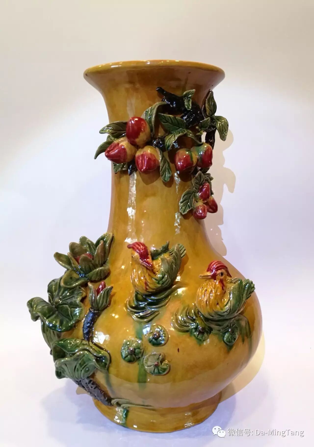 | 001 | 黄釉荷叶鸳鸯寿桃瓶手制 尺寸:H47cm 交流价:400 |