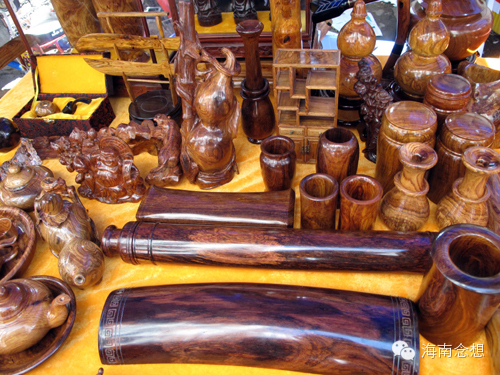 东湖市场街道虽以花鸟为名,但除了街道入口处几家花市、鸟市外,街道内别无他家,事实上,街道里摊位卖的多是海南特色工艺品及古玩,尤以海南三宝(海南黄花梨、海捞瓷和黎族织锦)为主打,而店铺多是集海南黄花梨工艺品加工销售为一体的店面。