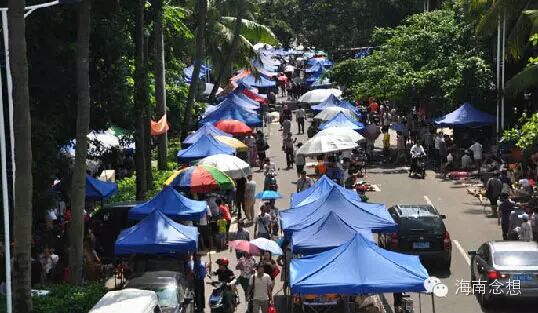 从上世纪80年代开始,海口已有类似的集市,但主要位于海口戏院附近,以花草木根为主打商品,其规模跟如今的比是不言而喻的。到了90年代,政府开始加强管理,整顿市容市貌,本来在戏院附近的小商贩不得不搬迁至管理稍松的公园路。90年代在公园路旁自发形成的小集市还相当不完善,以流动商贩为主,并没有固定的店面,也并没有像现在一样固定的周末售货时间。到2003年,小集市也只不过是由几家卖花梨木家具及工艺品的店铺组成。直到2005才显现出雏形,后来不断有小商贩的加入,便形成了今日的模样。摆摊的挨着有店面的,店面连着店面,形成一排长长的海南三宝“观赏长廊”。
