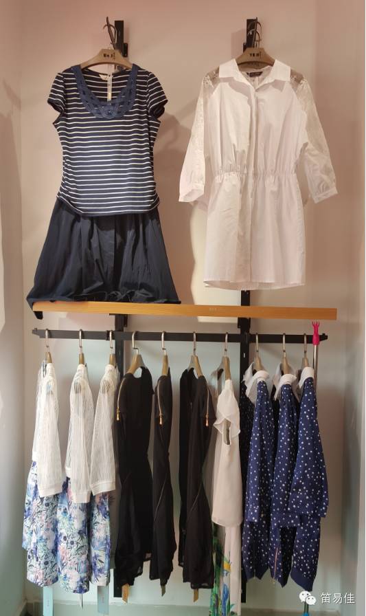 A区点挂陈列:货品:两件套装、裤子、外套、连衣裙、T恤