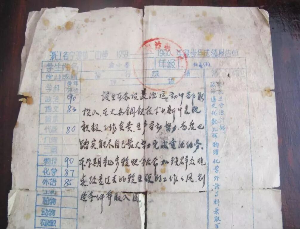 然而,俞小鲁告诉记者,他们家的“传家宝”早就心有所属,永远只有一件,那就是他的一张1960年7月宁波二中初中毕业的成绩报告单。这个宝贝在别人眼里可能分文不值,在他眼里却是无价之宝,看到它,眼前就会叠加出许多画面,想起行动不便的老父亲,想起困顿生活中的坚强、乐观与斗志,想起一生秉持的信念:别人能做的,我也一定能学会,并且做得更好!