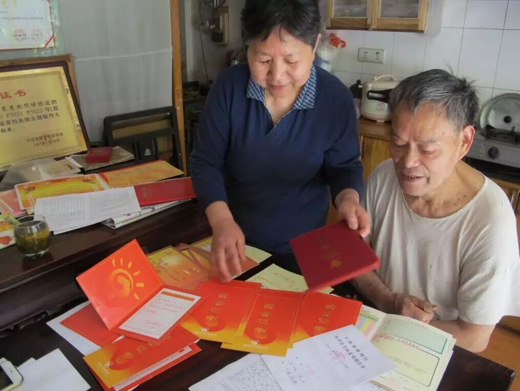 ▲俞小鲁与老伴向记者展示孙女俞同和获得的各类奖状证书