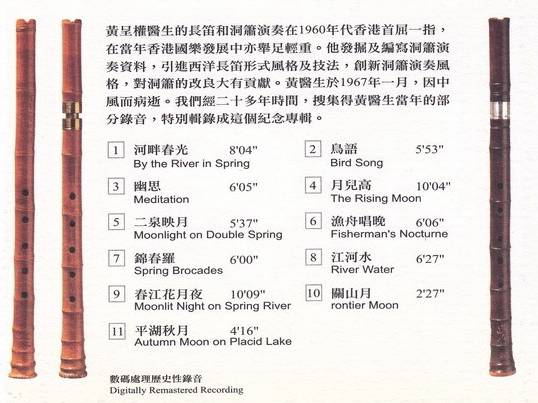 于此,我们可以见到黄呈权委实是花了很多心血去开拓洞箫的曲目的,在上文提及“空谷”那两张唱片,亦有这类由他亲自移植的箫曲,例如《水河淌水》,是他根据一首写给双簧管独奏的作品移植过来的。另一首《牧童》,本是内地音乐人锺义良为十一孔新笛写的曲子,黄医生改为洞箫曲。