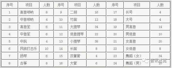 2018年高水平艺术团招收项目:高音唢呐、中音唢呐、高音笙、中音笙、中阮、民族打击乐、扬琴、古筝、二胡、竹笛、大提琴、低音提琴、小提琴、长笛、双簧管、大管、长号、大号、男高音、男低音、女高音、女低音、舞蹈(男、女)。