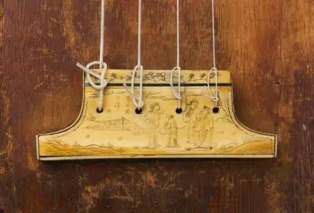 6、纳音:即“出音孔”,品位粘在用梧桐板制成的“面板”上,四条弦系在下端“覆手”的四个小孔内,,开有一个小孔。