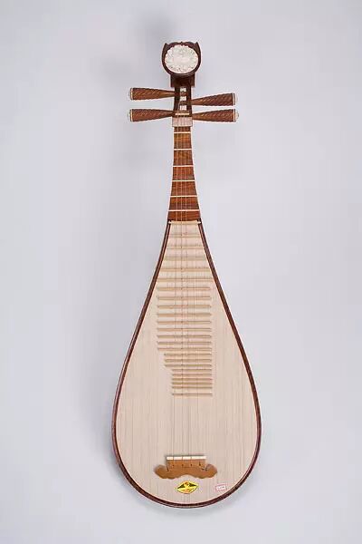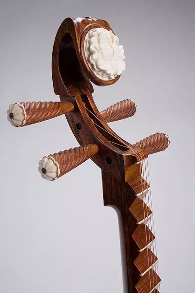 6、高音琵琶:琴身右上部为新月形,腹面上开有音孔和音窗,琴内音柱可调,发音比一般琵琶高一个八度,高低音平衡,音色动听。