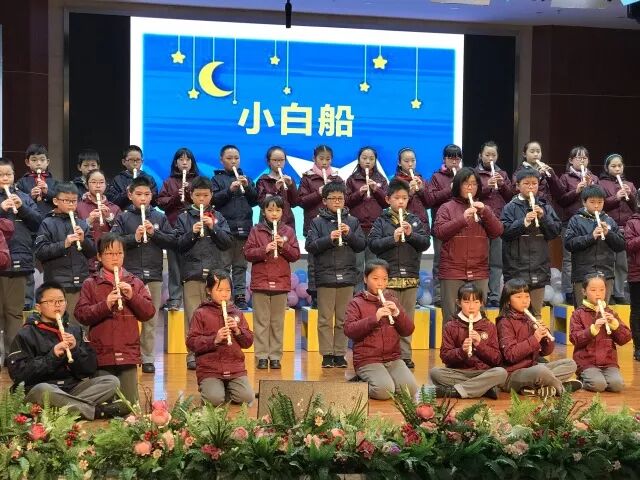 最后,学校竖笛社团五十六位孩子为全场观众激情上演了一首美妙变幻、悠扬动听的合奏曲《小白船》,孩子们深情的演奏将本场音乐会推向了高潮。