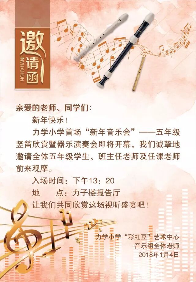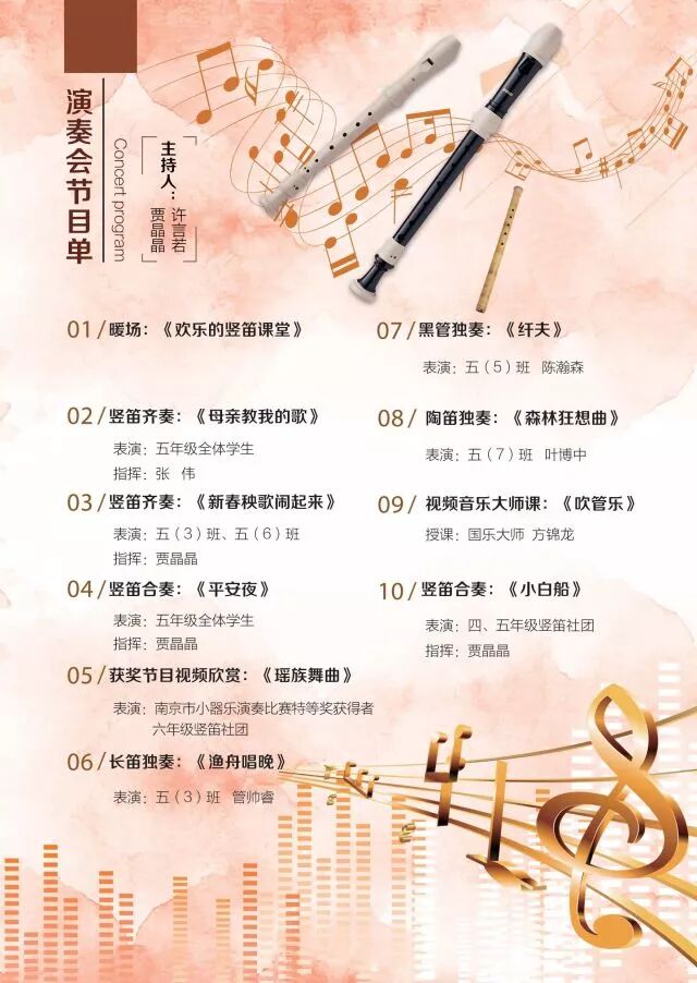 在贾晶晶老师和许言若同学的主持声中,音乐团队酝酿已久、精心策划的力学小学首场新年音乐会:“指尖上的舞蹈——五年级器乐欣赏暨竖笛演奏会”开幕啦!