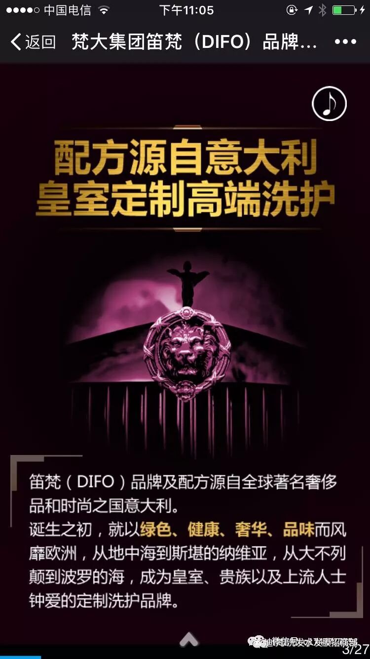 笛梵"既"1958意大利笛梵/DIFO",品牌来自世界著名的奢侈品和时尚帝都——意大利,以绿色、健康、奢华、品味的理念,给秀发和头皮全新的呵护。 笛弄晚风花弄影,人如云,发如水,袅袅相依梵自随。 品牌给人的感觉是高档、优雅、专业、可靠和品质。是专业美发产品领域中的领导者之一。