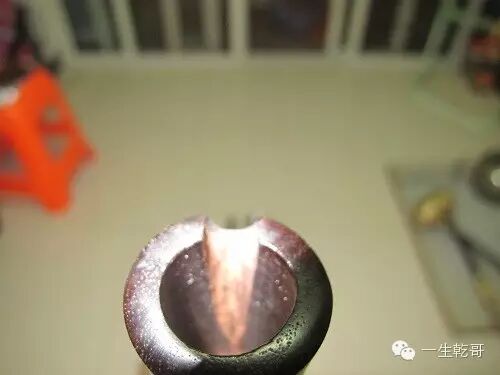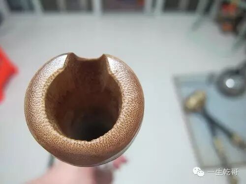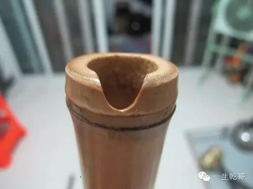 南箫没有顶盖,也就不存在方形进气口一说,整个南箫顶端都是进气口,进气口的大小由吹箫者下巴和嘴唇控制。南箫的吹口一般是外“U”内“V”口。也有直接做成“V”型口的,比方说“戈建明”戈式家族的红木南箫。据说定制箫的时候可以和制箫师傅提出吹口型制。鲍氏家族南箫则是“U”型吹口。一生乾哥认为内“V”口应该作为南箫的一个特征性标志的,不然和洞箫没什么区别了。玩箫的该懂得,一支箫有没有根节对于音色音质没啥影响,吹口、进气方式则是决定音色,音质的一个重要方面。南箫音色粗犷浑厚,这个“V”型口应该是起到一定作用的,甚至对于音量的调节也有帮助。“U”型口则太过于圆润。