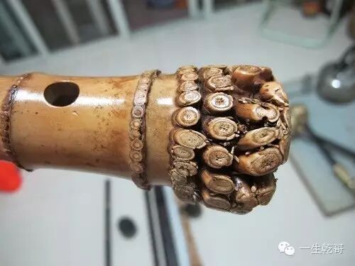 雕工和刻字,实际上有的箫还有字画在上边,应该非常精美。对了,忘记说一句,大多数名家制箫都会有相应的印章在上边的,一般也都在箫的低端。