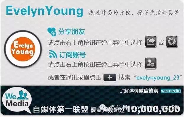 EvelynYoung是自媒体WeMedia联盟成员,WeMedia是自媒体第一联盟,覆盖1000万人群。详情搜索“wemedia2013”