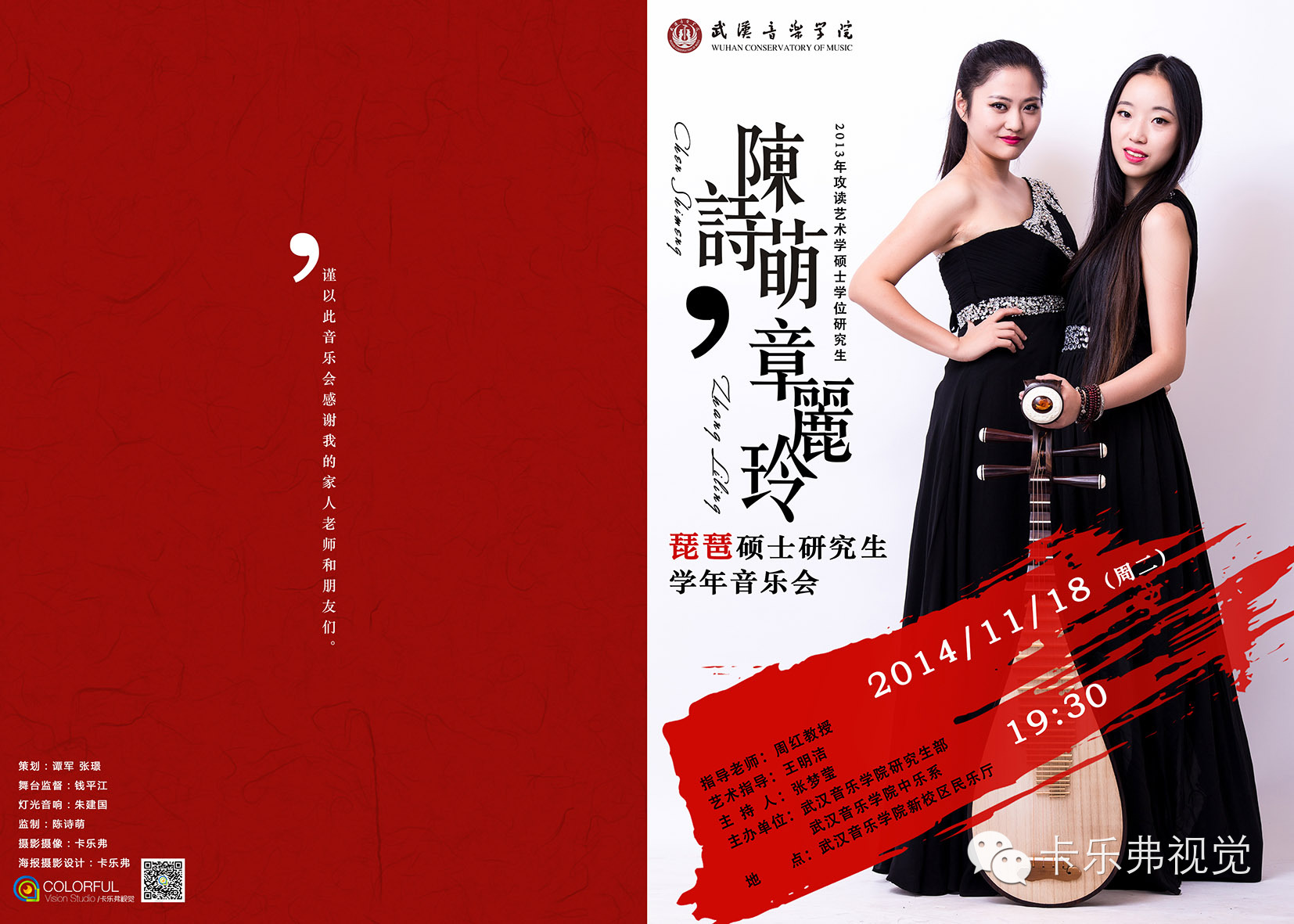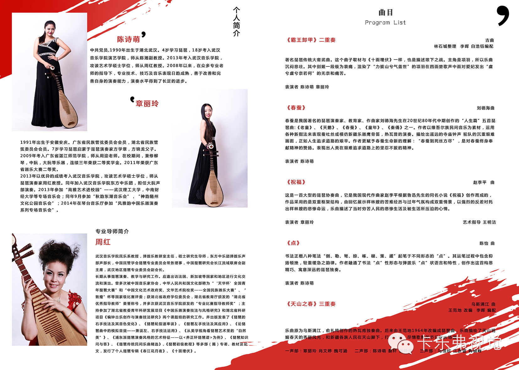 陈诗萌,中共党员,1990年出生于湖北武汉。4岁学习琵琶,18岁考入武汉音乐学院演艺学院,师从陈湘副教授。2013年考入武汉音乐学院,攻读艺术学硕士学位,师从周红教授。2008年以来,在众多专业老师的指导下,专业技术、技巧及音乐表现日趋成熟,善于改善和完善自身的演奏能力,演奏水平得到了长足的进步。