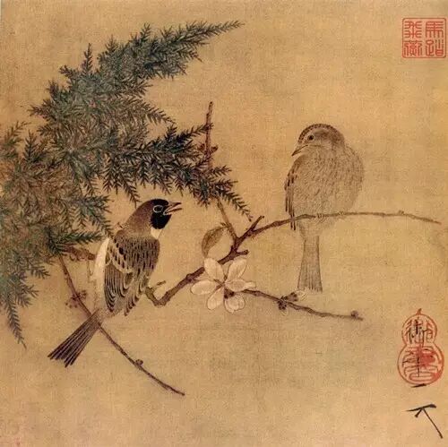 上图为宋徽宗《腊梅双禽图》,右下角为“天下一人”花押及题款。花押,就是个人签名。它的外形,特别巧出心裁,有点像结构松散的“天”字,又像一个简写的“开”字,实际上是由“天下一人”四个字组成,四笔写成。