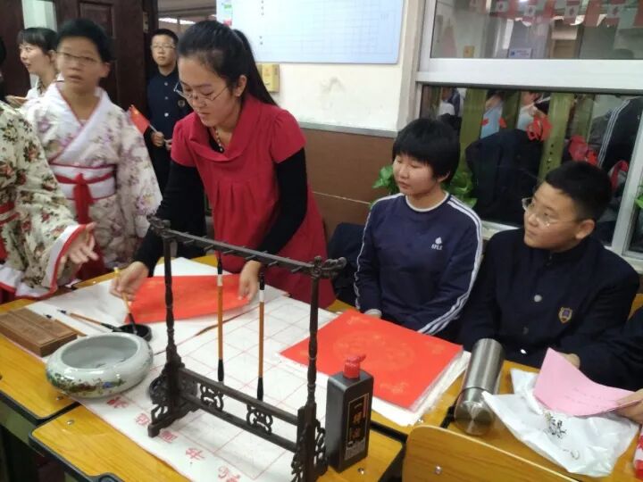 中国传统文化气质出众的语文老师杜伟娜,带领学生进行茶艺展示。