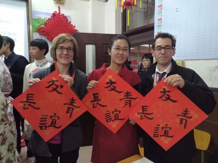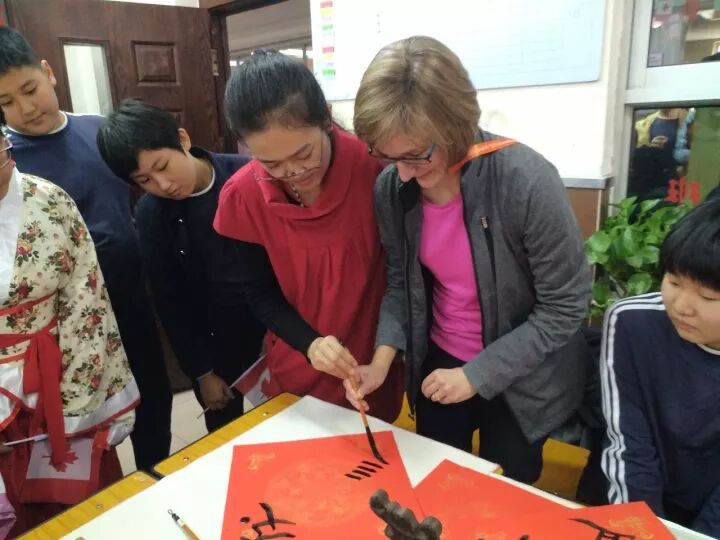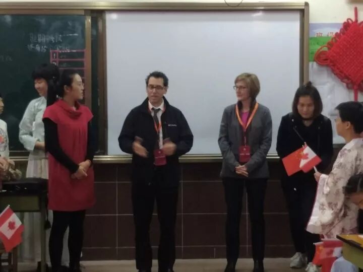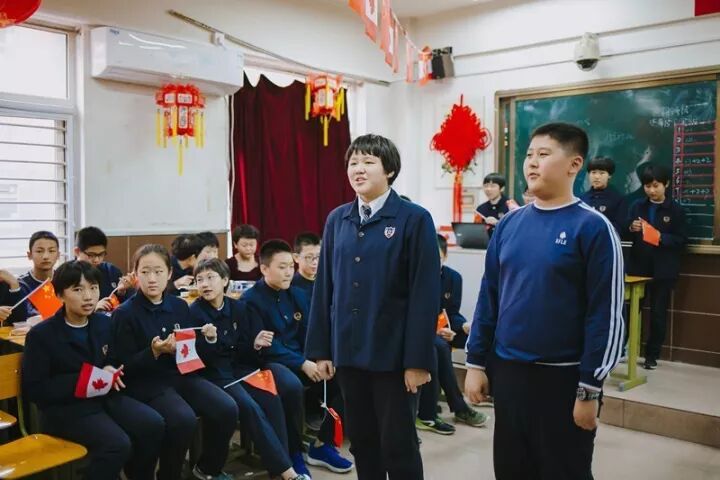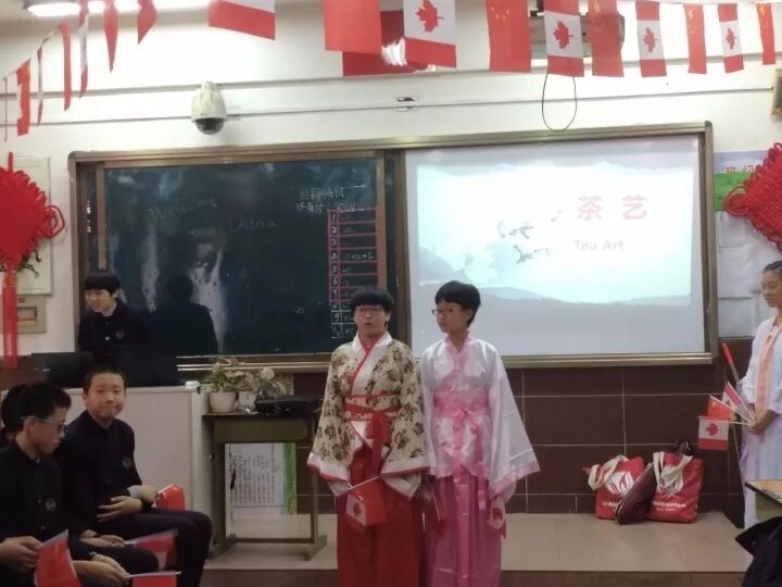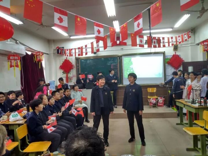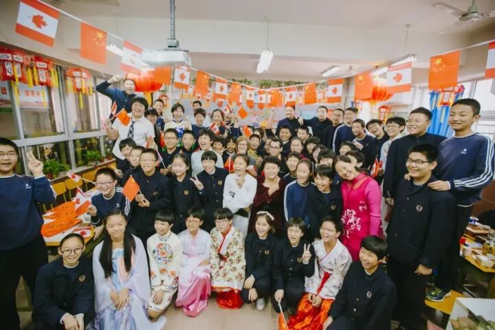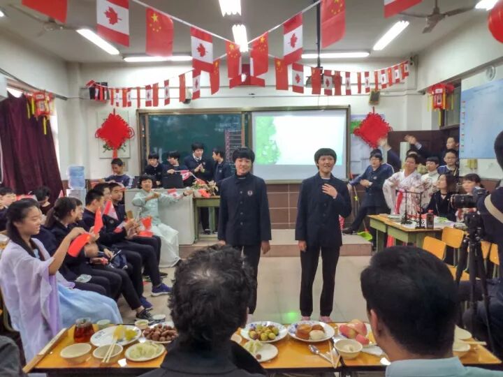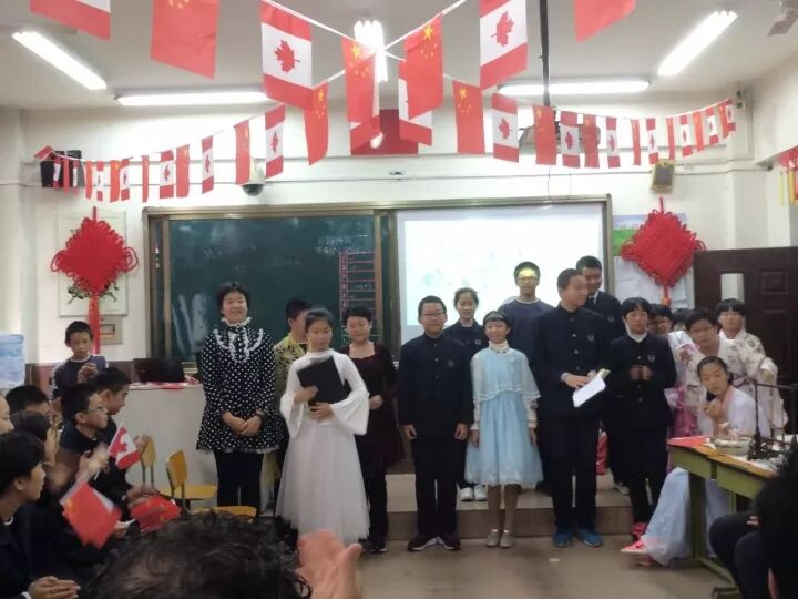 除了服装,同学们还精心布置了教室,随处可见灯笼、中国结等中国元素,同时挂满了中加两国国旗。