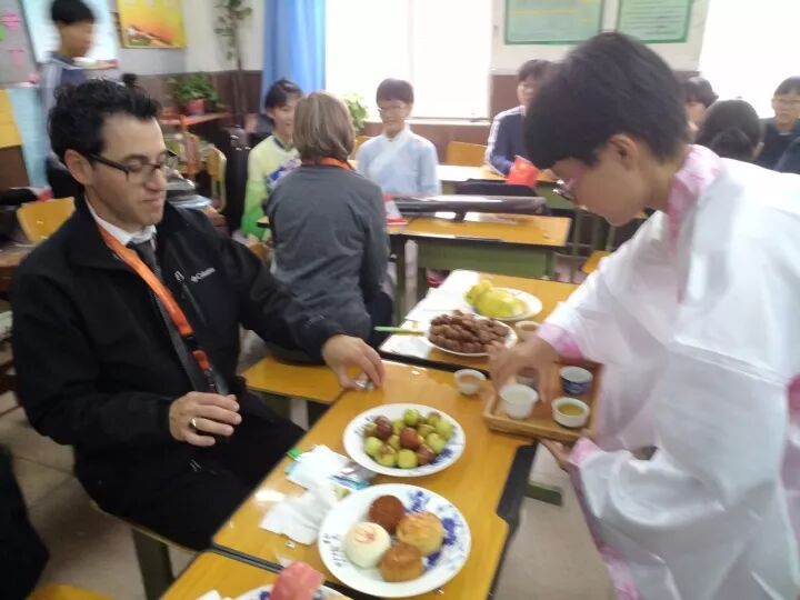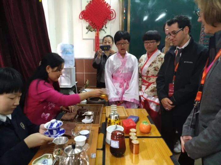小主持用英文介绍中国茶文化,同学们现场演示茶艺,向外国友人敬茶,展示中国传统文化的博大精深。