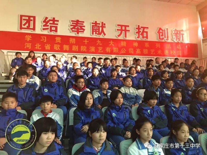 为了贯彻党的十九大精神,进一步推动学校艺术教育的全面健康发展,培养学生良好的审美情趣与艺术素养,12月4日,我校合唱队、舞蹈队及初一年级部分学生参加了由河北省歌舞剧院组织的“2017高雅艺术进校园活动”。
