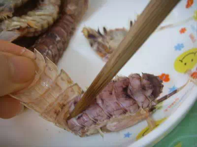 2.用根筷子从尾部贴着虾壳插到头附近。