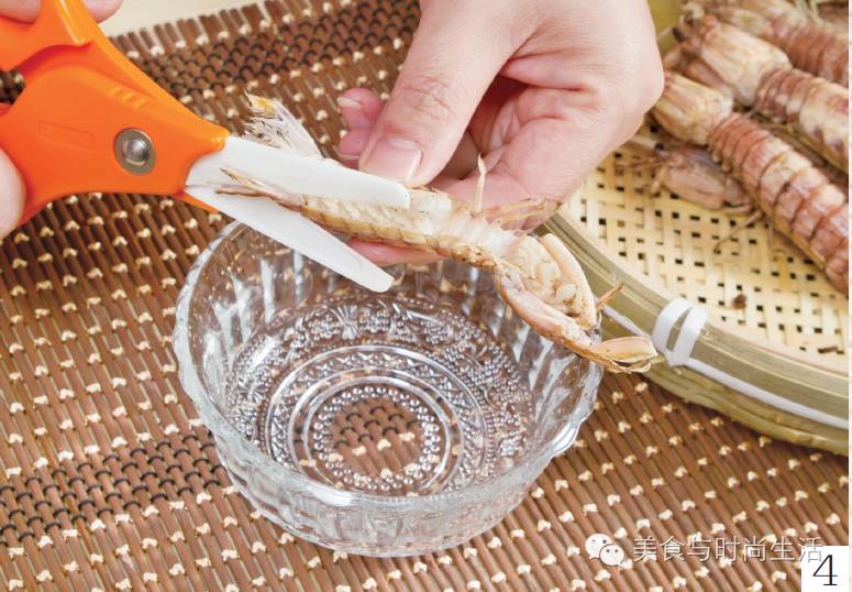 4.熟虾取出后,用剪刀将皮皮虾两边剪开。