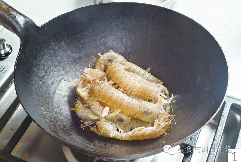 2.皮皮虾置于姜片上,小火烧至皮皮虾自身水分略干。